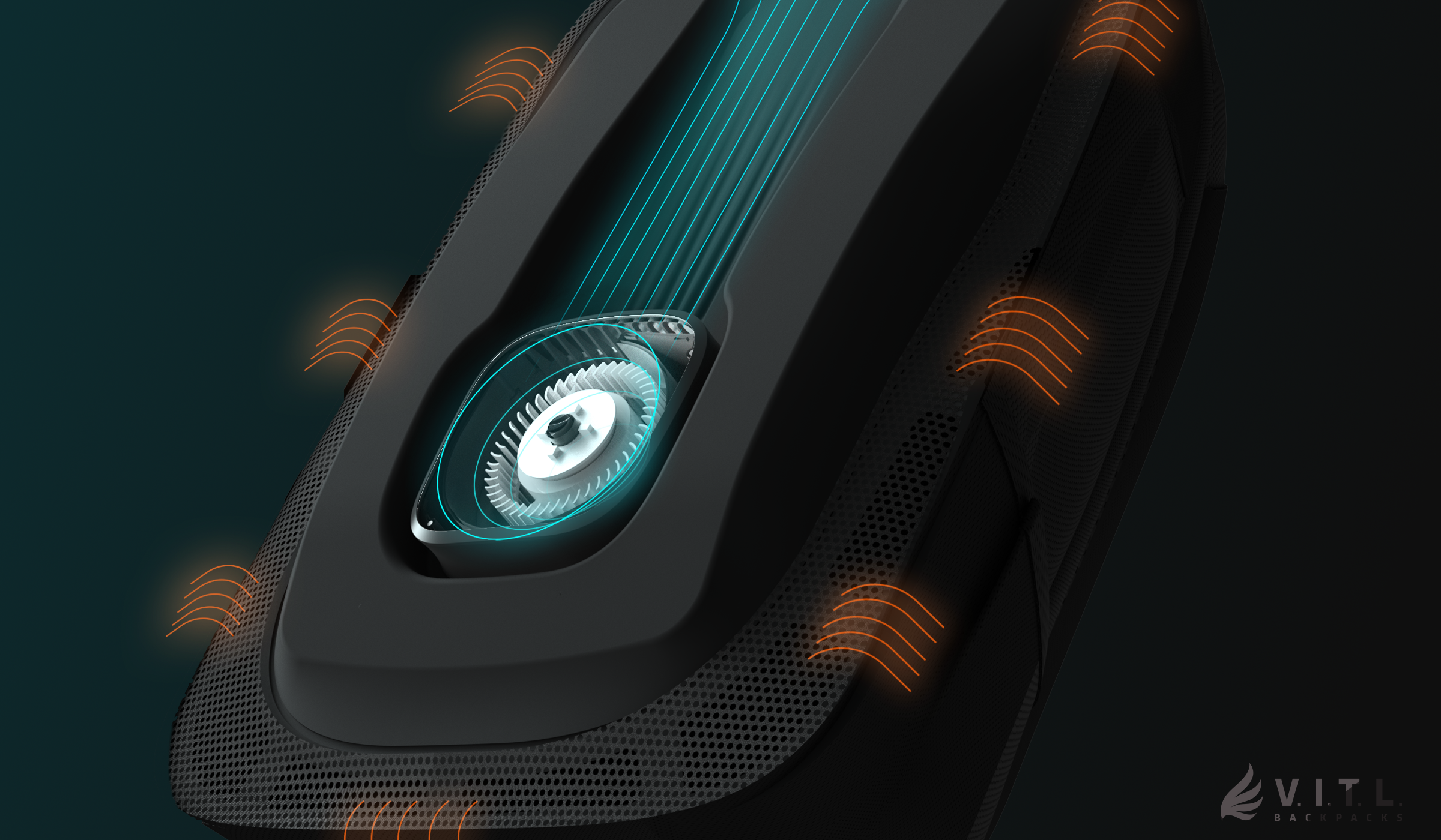 V.I.T.L. cooling backpacks are different from traditional packs because they reduce the contact points between the wearer and the bag allowing sweat to escape more easily. Additionally, V.I.T.L. uses a built-in active cooling system that accelerates the evaporation of sweat and directs a refreshing breeze over the wearer’s back, neck, and shoulders. Together, this significantly minimizes the overall “sweat footprint” most other bags leave behind.